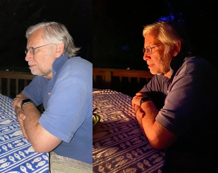 In these examples, our family had a candlelit dinner on our deck in the no-power aftermath of Tropical Storm Isaias. Pam got these shots by the light of 2 candles and some lingering dusk. Pretty great by any prior standards. This new iPhone technology reduces camera shake and it combines information from multiple exposures to give you a sharper, higher quality, image than before.